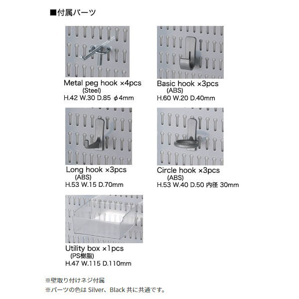 ※壁取り付けネジ付属 ※パーツの色は Silver、Black 共に共通です。