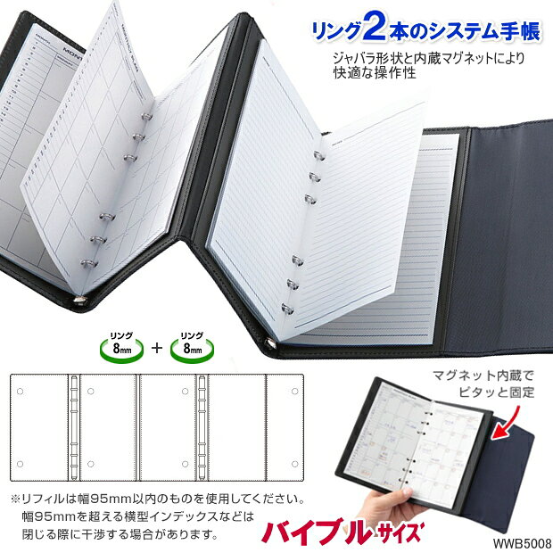 商品名 Keyword キーワード デュアルリングバインダー 聖書サイズ システム手帳(リング8mm×2) 品番 WWB5008B-ブラック/ WWB5008K-ネイビー/ WWB5008Z ワイン 材質 ポリエステル、PVC サイズ 閉じた状態:W120×H186×D33mm フルオープン状態:W532×H186×D15mm 重さ:約)292g リフィルサイズ:横95×縦170mm(バイブルサイズ 6穴) リフィル セット内容 パーソナルプロフィール(表紙)1枚/マンスリースケジュール(フリー)20枚/ チェックリスト 10枚/横罫ノート(5.0mm罫)20枚/ カードホルダー1枚 /裏表紙 仕様 リング内径:8mm×2 ※こちらの商品は名入れできません メーカー 株式会社 レイメイ藤井 2種類のリフィル、4ページ分を同時に見られるので、スケジュールとノート、仕事とプライベートでの使い分けなど、様々な組合せで使用できます。